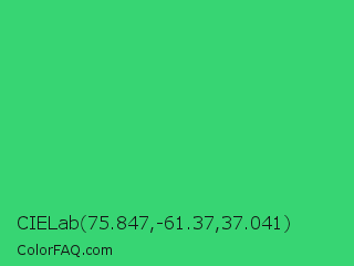 CIELab 75.847,-61.37,37.041 Color is a normal green color and the nearest color is UFO Green #3cd070. Hex code #37d573 and RGB value is rgb(55,213,115). In RGB color space, this color is composed of 22% red, 84% green, 45% blue, In CMYK color space, this color is composed of 74% cyan, 0% magenta, 46% yellow , 16% black , In HSL color space, this color has a hue angle of 143° , 65% saturation and 53% lightness.