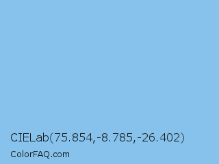 CIELab 75.854,-8.785,-26.402 Color is a light blue color and the nearest color is Jordy Blue #8ab9f1. Hex code #86c2eb and RGB value is rgb(134,194,235). In RGB color space, this color is composed of 53% red, 76% green, 92% blue, In CMYK color space, this color is composed of 43% cyan, 17% magenta, 0% yellow , 8% black , In HSL color space, this color has a hue angle of 204° , 72% saturation and 72% lightness.