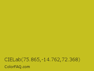 CIELab 75.865,-14.762,72.368 Color is a normal yellow color and the nearest color is Key Lime Pie #bfc921. Hex code #c5c01f and RGB value is rgb(197,192,31). In RGB color space, this color is composed of 77% red, 75% green, 12% blue, In CMYK color space, this color is composed of 0% cyan, 3% magenta, 84% yellow , 23% black , In HSL color space, this color has a hue angle of 58° , 73% saturation and 45% lightness.