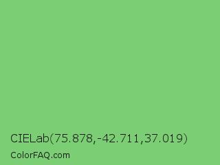 CIELab 75.878,-42.711,37.019 Color is a light green color and the nearest color is Pastel Green #77dd77. Hex code #7cce74 and RGB value is rgb(124,206,116). In RGB color space, this color is composed of 49% red, 81% green, 45% blue, In CMYK color space, this color is composed of 40% cyan, 0% magenta, 44% yellow , 19% black , In HSL color space, this color has a hue angle of 115° , 48% saturation and 63% lightness.
