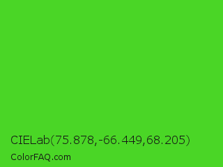 CIELab 75.878,-66.449,68.205 Color is a normal green color and the nearest color is Harlequin Green #46cb18. Hex code #4ad626 and RGB value is rgb(74,214,38). In RGB color space, this color is composed of 29% red, 84% green, 15% blue, In CMYK color space, this color is composed of 65% cyan, 0% magenta, 82% yellow , 16% black , In HSL color space, this color has a hue angle of 108° , 70% saturation and 49% lightness.