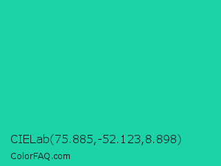 CIELab 75.885,-52.123,8.898 Color is a normal cyan color and the nearest color is Shamrock #33cc99. Hex code #1cd3a9 and RGB value is rgb(28,211,169). In RGB color space, this color is composed of 11% red, 83% green, 66% blue, In CMYK color space, this color is composed of 87% cyan, 0% magenta, 20% yellow , 17% black , In HSL color space, this color has a hue angle of 166° , 77% saturation and 47% lightness.