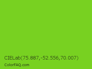 CIELab 75.887,-52.556,70.007 Color is a normal green color and the nearest color is Lima #76bd17. Hex code #78d121 and RGB value is rgb(120,209,33). In RGB color space, this color is composed of 47% red, 82% green, 13% blue, In CMYK color space, this color is composed of 43% cyan, 0% magenta, 84% yellow , 18% black , In HSL color space, this color has a hue angle of 90° , 73% saturation and 47% lightness.