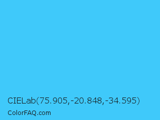 CIELab 75.905,-20.848,-34.595 Color is a light blue color and the nearest color is Picton Blue #45b1e8. Hex code #3fc9fa and RGB value is rgb(63,201,250). In RGB color space, this color is composed of 25% red, 79% green, 98% blue, In CMYK color space, this color is composed of 75% cyan, 20% magenta, 0% yellow , 2% black , In HSL color space, this color has a hue angle of 196° , 95% saturation and 61% lightness.