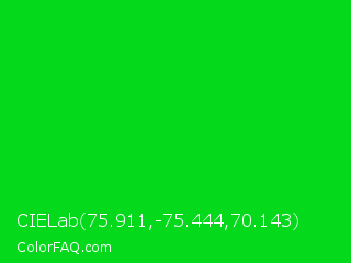 CIELab 75.911,-75.444,70.143 Color is a normal green color and the nearest color is Vivid Malachite #00cc33. Hex code #05d91c and RGB value is rgb(5,217,28). In RGB color space, this color is composed of 2% red, 85% green, 11% blue, In CMYK color space, this color is composed of 98% cyan, 0% magenta, 87% yellow , 15% black , In HSL color space, this color has a hue angle of 127° , 95% saturation and 44% lightness.