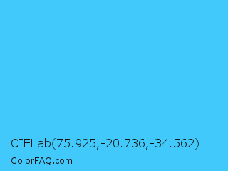 CIELab 75.925,-20.736,-34.562 Color is a light blue color and the nearest color is Picton Blue #45b1e8. Hex code #40c9fa and RGB value is rgb(64,201,250). In RGB color space, this color is composed of 25% red, 79% green, 98% blue, In CMYK color space, this color is composed of 74% cyan, 20% magenta, 0% yellow , 2% black , In HSL color space, this color has a hue angle of 196° , 95% saturation and 62% lightness.