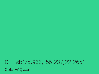 CIELab 75.933,-56.237,22.265 Color is a normal green color and the nearest color is Shamrock #33cc99. Hex code #32d490 and RGB value is rgb(50,212,144). In RGB color space, this color is composed of 20% red, 83% green, 56% blue, In CMYK color space, this color is composed of 76% cyan, 0% magenta, 32% yellow , 17% black , In HSL color space, this color has a hue angle of 155° , 65% saturation and 51% lightness.