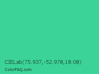 CIELab 75.937,-52.978,18.08 Color is a normal green color and the nearest color is Shamrock #33cc99. Hex code #3bd398 and RGB value is rgb(59,211,152). In RGB color space, this color is composed of 23% red, 83% green, 60% blue, In CMYK color space, this color is composed of 72% cyan, 0% magenta, 28% yellow , 17% black , In HSL color space, this color has a hue angle of 157° , 63% saturation and 53% lightness.