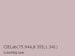 CIELab 75.944,8.355,1.341 Color is a light red color and the nearest color is Cold Turkey #cebaba. Hex code #ccb6b9 and RGB value is rgb(204,182,185). In RGB color space, this color is composed of 80% red, 71% green, 73% blue, In CMYK color space, this color is composed of 0% cyan, 11% magenta, 9% yellow , 20% black , In HSL color space, this color has a hue angle of 352° , 18% saturation and 76% lightness.