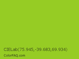 CIELab 75.945,-39.683,69.934 Color is a normal lime color and the nearest color is Atlantis #97cd2d. Hex code #96cc24 and RGB value is rgb(150,204,36). In RGB color space, this color is composed of 59% red, 80% green, 14% blue, In CMYK color space, this color is composed of 26% cyan, 0% magenta, 82% yellow , 20% black , In HSL color space, this color has a hue angle of 79° , 70% saturation and 47% lightness.