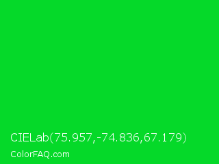 CIELab 75.957,-74.836,67.179 Color is a normal green color and the nearest color is Vivid Malachite #00cc33. Hex code #05d929 and RGB value is rgb(5,217,41). In RGB color space, this color is composed of 2% red, 85% green, 16% blue, In CMYK color space, this color is composed of 98% cyan, 0% magenta, 81% yellow , 15% black , In HSL color space, this color has a hue angle of 130° , 95% saturation and 44% lightness.