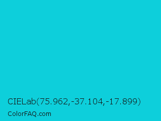 CIELab 75.962,-37.104,-17.899 Color is a normal cyan color and the nearest color is Dark Turquoise #00ced1. Hex code #0dcfdb and RGB value is rgb(13,207,219). In RGB color space, this color is composed of 5% red, 81% green, 86% blue, In CMYK color space, this color is composed of 94% cyan, 5% magenta, 0% yellow , 14% black , In HSL color space, this color has a hue angle of 183° , 89% saturation and 45% lightness.