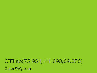 CIELab 75.964,-41.898,69.076 Color is a normal green color and the nearest color is Atlantis #97cd2d. Hex code #91cd27 and RGB value is rgb(145,205,39). In RGB color space, this color is composed of 57% red, 80% green, 15% blue, In CMYK color space, this color is composed of 29% cyan, 0% magenta, 81% yellow , 20% black , In HSL color space, this color has a hue angle of 82° , 68% saturation and 48% lightness.
