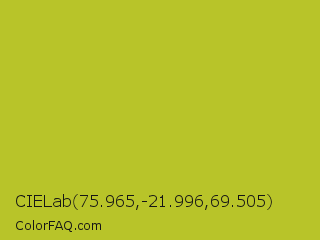 CIELab 75.965,-21.996,69.505 Color is a normal yellow color and the nearest color is Key Lime Pie #bfc921. Hex code #b8c429 and RGB value is rgb(184,196,41). In RGB color space, this color is composed of 72% red, 77% green, 16% blue, In CMYK color space, this color is composed of 6% cyan, 0% magenta, 79% yellow , 23% black , In HSL color space, this color has a hue angle of 65° , 65% saturation and 46% lightness.