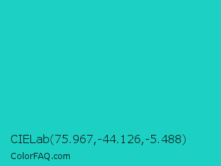 CIELab 75.967,-44.126,-5.488 Color is a normal cyan color and the nearest color is Java #1fc2c2. Hex code #1cd1c4 and RGB value is rgb(28,209,196). In RGB color space, this color is composed of 11% red, 82% green, 77% blue, In CMYK color space, this color is composed of 87% cyan, 0% magenta, 6% yellow , 18% black , In HSL color space, this color has a hue angle of 176° , 76% saturation and 46% lightness.