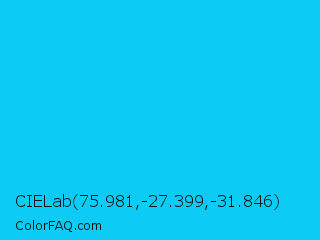 CIELab 75.981,-27.399,-31.846 Color is a normal cyan color and the nearest color is Spiro Disco Ball #0fc0fc. Hex code #0cccf5 and RGB value is rgb(12,204,245). In RGB color space, this color is composed of 5% red, 80% green, 96% blue, In CMYK color space, this color is composed of 95% cyan, 17% magenta, 0% yellow , 4% black , In HSL color space, this color has a hue angle of 191° , 92% saturation and 50% lightness.