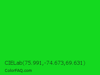 CIELab 75.991,-74.673,69.631 Color is a normal green color and the nearest color is Vivid Malachite #00cc33. Hex code #14d91f and RGB value is rgb(20,217,31). In RGB color space, this color is composed of 8% red, 85% green, 12% blue, In CMYK color space, this color is composed of 91% cyan, 0% magenta, 86% yellow , 15% black , In HSL color space, this color has a hue angle of 123° , 83% saturation and 46% lightness.