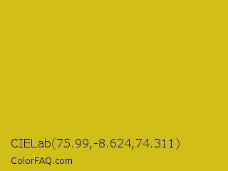 CIELab 75.99,-8.624,74.311 Color is a normal yellow color and the nearest color is Gold Tips #deba13. Hex code #d0bd18 and RGB value is rgb(208,189,24). In RGB color space, this color is composed of 82% red, 74% green, 9% blue, In CMYK color space, this color is composed of 0% cyan, 9% magenta, 88% yellow , 18% black , In HSL color space, this color has a hue angle of 54° , 79% saturation and 45% lightness.