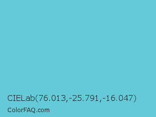 CIELab 76.013,-25.791,-16.047 Color is a light cyan color and the nearest color is Viking #64ccdb. Hex code #64cad8 and RGB value is rgb(100,202,216). In RGB color space, this color is composed of 39% red, 79% green, 85% blue, In CMYK color space, this color is composed of 54% cyan, 6% magenta, 0% yellow , 15% black , In HSL color space, this color has a hue angle of 187° , 60% saturation and 62% lightness.