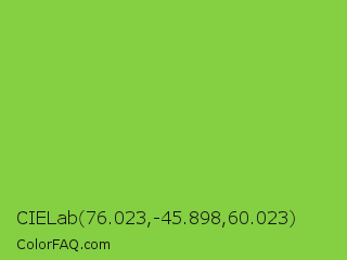 CIELab 76.023,-45.898,60.023 Color is a normal green color and the nearest color is Kiwi #8ee53f. Hex code #84cf42 and RGB value is rgb(132,207,66). In RGB color space, this color is composed of 52% red, 81% green, 26% blue, In CMYK color space, this color is composed of 36% cyan, 0% magenta, 68% yellow , 19% black , In HSL color space, this color has a hue angle of 92° , 59% saturation and 54% lightness.
