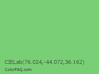 CIELab 76.024,-44.072,36.162 Color is a light green color and the nearest color is Pastel Green #77dd77. Hex code #78cf76 and RGB value is rgb(120,207,118). In RGB color space, this color is composed of 47% red, 81% green, 46% blue, In CMYK color space, this color is composed of 42% cyan, 0% magenta, 43% yellow , 19% black , In HSL color space, this color has a hue angle of 119° , 48% saturation and 64% lightness.