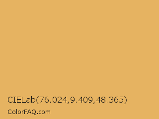 CIELab 76.024,9.409,48.365 Color is a light orange color and the nearest color is Porsche #eaae69. Hex code #e6b361 and RGB value is rgb(230,179,97). In RGB color space, this color is composed of 90% red, 70% green, 38% blue, In CMYK color space, this color is composed of 0% cyan, 22% magenta, 58% yellow , 10% black , In HSL color space, this color has a hue angle of 37° , 73% saturation and 64% lightness.