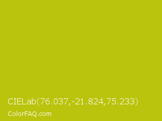 CIELab 76.037,-21.824,75.233 Color is a normal yellow color and the nearest color is La Rioja #b3c110. Hex code #bac40d and RGB value is rgb(186,196,13). In RGB color space, this color is composed of 73% red, 77% green, 5% blue, In CMYK color space, this color is composed of 5% cyan, 0% magenta, 93% yellow , 23% black , In HSL color space, this color has a hue angle of 63° , 88% saturation and 41% lightness.