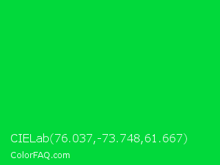 CIELab 76.037,-73.748,61.667 Color is a normal green color and the nearest color is Vivid Malachite #00cc33. Hex code #01d93b and RGB value is rgb(1,217,59). In RGB color space, this color is composed of 0% red, 85% green, 23% blue, In CMYK color space, this color is composed of 100% cyan, 0% magenta, 73% yellow , 15% black , In HSL color space, this color has a hue angle of 136° , 99% saturation and 43% lightness.