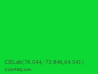 CIELab 76.044,-73.846,64.041 Color is a normal green color and the nearest color is Vivid Malachite #00cc33. Hex code #0dd934 and RGB value is rgb(13,217,52). In RGB color space, this color is composed of 5% red, 85% green, 20% blue, In CMYK color space, this color is composed of 94% cyan, 0% magenta, 76% yellow , 15% black , In HSL color space, this color has a hue angle of 131° , 89% saturation and 45% lightness.