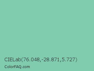 CIELab 76.048,-28.871,5.727 Color is a light green color and the nearest color is Vista Blue #8fd6b4. Hex code #80cab0 and RGB value is rgb(128,202,176). In RGB color space, this color is composed of 50% red, 79% green, 69% blue, In CMYK color space, this color is composed of 37% cyan, 0% magenta, 13% yellow , 21% black , In HSL color space, this color has a hue angle of 159° , 41% saturation and 65% lightness.