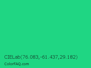 CIELab 76.083,-61.437,29.182 Color is a normal green color and the nearest color is Shamrock #33cc99. Hex code #1fd683 and RGB value is rgb(31,214,131). In RGB color space, this color is composed of 12% red, 84% green, 51% blue, In CMYK color space, this color is composed of 86% cyan, 0% magenta, 39% yellow , 16% black , In HSL color space, this color has a hue angle of 153° , 75% saturation and 48% lightness.