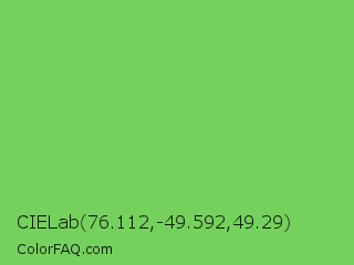 CIELab 76.112,-49.592,49.29 Color is a normal green color and the nearest color is Mantis #74c365. Hex code #74d15b and RGB value is rgb(116,209,91). In RGB color space, this color is composed of 45% red, 82% green, 36% blue, In CMYK color space, this color is composed of 44% cyan, 0% magenta, 56% yellow , 18% black , In HSL color space, this color has a hue angle of 107° , 56% saturation and 59% lightness.