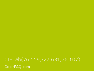 CIELab 76.119,-27.631,76.107 Color is a normal yellow color and the nearest color is Bahia #a5cb0c. Hex code #b0c702 and RGB value is rgb(176,199,2). In RGB color space, this color is composed of 69% red, 78% green, 1% blue, In CMYK color space, this color is composed of 12% cyan, 0% magenta, 99% yellow , 22% black , In HSL color space, this color has a hue angle of 67° , 98% saturation and 39% lightness.