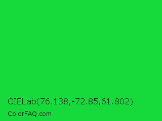 CIELab 76.138,-72.85,61.802 Color is a normal green color and the nearest color is Malachite #0bda51. Hex code #16d93b and RGB value is rgb(22,217,59). In RGB color space, this color is composed of 9% red, 85% green, 23% blue, In CMYK color space, this color is composed of 90% cyan, 0% magenta, 73% yellow , 15% black , In HSL color space, this color has a hue angle of 131° , 82% saturation and 47% lightness.