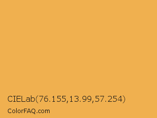 CIELab 76.155,13.99,57.254 Color is a light orange color and the nearest color is Maximum Yellow Red #f2ba49. Hex code #f0b04f and RGB value is rgb(240,176,79). In RGB color space, this color is composed of 94% red, 69% green, 31% blue, In CMYK color space, this color is composed of 0% cyan, 27% magenta, 67% yellow , 6% black , In HSL color space, this color has a hue angle of 36° , 84% saturation and 63% lightness.