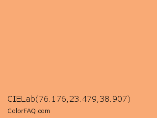 CIELab 76.176,23.479,38.907 Color is a light orange color and the nearest color is Very Light Tangelo #ffb077. Hex code #f9aa75 and RGB value is rgb(249,170,117). In RGB color space, this color is composed of 98% red, 67% green, 46% blue, In CMYK color space, this color is composed of 0% cyan, 32% magenta, 53% yellow , 2% black , In HSL color space, this color has a hue angle of 24° , 92% saturation and 72% lightness.