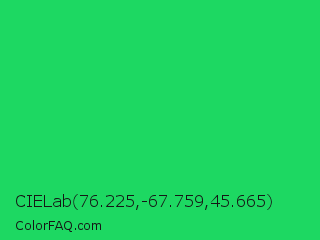 CIELab 76.225,-67.759,45.665 Color is a normal green color and the nearest color is Malachite #0bda51. Hex code #1dd862 and RGB value is rgb(29,216,98). In RGB color space, this color is composed of 11% red, 85% green, 38% blue, In CMYK color space, this color is composed of 87% cyan, 0% magenta, 55% yellow , 15% black , In HSL color space, this color has a hue angle of 142° , 76% saturation and 48% lightness.