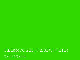 CIELab 76.225,-72.814,74.112 Color is a normal green color and the nearest color is Harlequin Green #46cb18. Hex code #30d900 and RGB value is rgb(48,217,0). In RGB color space, this color is composed of 19% red, 85% green, 0% blue, In CMYK color space, this color is composed of 78% cyan, 0% magenta, 100% yellow , 15% black , In HSL color space, this color has a hue angle of 107° , 100% saturation and 43% lightness.
