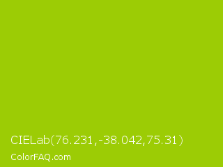 CIELab 76.231,-38.042,75.31 Color is a normal lime color and the nearest color is Citrus #a1c50a. Hex code #9ccc05 and RGB value is rgb(156,204,5). In RGB color space, this color is composed of 61% red, 80% green, 2% blue, In CMYK color space, this color is composed of 24% cyan, 0% magenta, 98% yellow , 20% black , In HSL color space, this color has a hue angle of 74° , 95% saturation and 41% lightness.