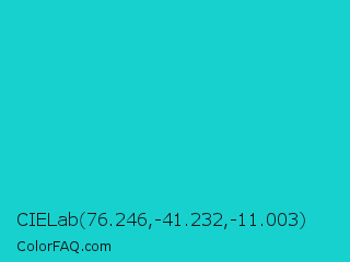 CIELab 76.246,-41.232,-11.003 Color is a normal cyan color and the nearest color is Java #1fc2c2. Hex code #17d1cf and RGB value is rgb(23,209,207). In RGB color space, this color is composed of 9% red, 82% green, 81% blue, In CMYK color space, this color is composed of 89% cyan, 0% magenta, 1% yellow , 18% black , In HSL color space, this color has a hue angle of 179° , 80% saturation and 45% lightness.