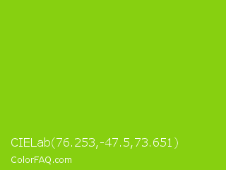 CIELab 76.253,-47.5,73.651 Color is a normal green color and the nearest color is Sheen Green #8fd400. Hex code #87d010 and RGB value is rgb(135,208,16). In RGB color space, this color is composed of 53% red, 82% green, 6% blue, In CMYK color space, this color is composed of 35% cyan, 0% magenta, 92% yellow , 18% black , In HSL color space, this color has a hue angle of 83° , 86% saturation and 44% lightness.