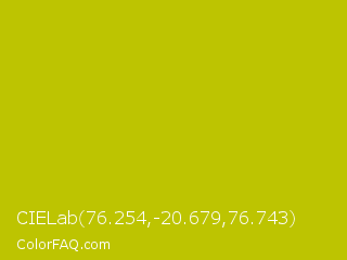 CIELab 76.254,-20.679,76.743 Color is a normal yellow color and the nearest color is Rio Grande #bbd009. Hex code #bdc401 and RGB value is rgb(189,196,1). In RGB color space, this color is composed of 74% red, 77% green, 0% blue, In CMYK color space, this color is composed of 4% cyan, 0% magenta, 99% yellow , 23% black , In HSL color space, this color has a hue angle of 62° , 99% saturation and 39% lightness.