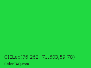 CIELab 76.262,-71.603,59.78 Color is a normal green color and the nearest color is Lime Green #32cd32. Hex code #20d941 and RGB value is rgb(32,217,65). In RGB color space, this color is composed of 13% red, 85% green, 25% blue, In CMYK color space, this color is composed of 85% cyan, 0% magenta, 70% yellow , 15% black , In HSL color space, this color has a hue angle of 131° , 74% saturation and 49% lightness.