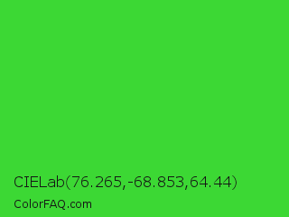 CIELab 76.265,-68.853,64.44 Color is a normal green color and the nearest color is Lime Green #32cd32. Hex code #3cd834 and RGB value is rgb(60,216,52). In RGB color space, this color is composed of 24% red, 85% green, 20% blue, In CMYK color space, this color is composed of 72% cyan, 0% magenta, 76% yellow , 15% black , In HSL color space, this color has a hue angle of 117° , 68% saturation and 53% lightness.