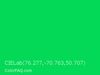 CIELab 76.277,-70.763,50.707 Color is a normal green color and the nearest color is Malachite #0bda51. Hex code #04d957 and RGB value is rgb(4,217,87). In RGB color space, this color is composed of 2% red, 85% green, 34% blue, In CMYK color space, this color is composed of 98% cyan, 0% magenta, 60% yellow , 15% black , In HSL color space, this color has a hue angle of 143° , 96% saturation and 43% lightness.