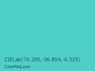 CIELab 76.295,-36.854,-6.525 Color is a normal cyan color and the nearest color is Medium Turquoise #48d1cc. Hex code #4ecfc7 and RGB value is rgb(78,207,199). In RGB color space, this color is composed of 31% red, 81% green, 78% blue, In CMYK color space, this color is composed of 62% cyan, 0% magenta, 4% yellow , 19% black , In HSL color space, this color has a hue angle of 176° , 57% saturation and 56% lightness.