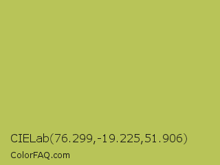 CIELab 76.299,-19.225,51.906 Color is a normal yellow color and the nearest color is Celery #b8c25d. Hex code #b8c458 and RGB value is rgb(184,196,88). In RGB color space, this color is composed of 72% red, 77% green, 35% blue, In CMYK color space, this color is composed of 6% cyan, 0% magenta, 55% yellow , 23% black , In HSL color space, this color has a hue angle of 67° , 48% saturation and 56% lightness.