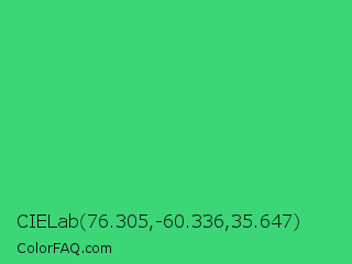 CIELab 76.305,-60.336,35.647 Color is a normal green color and the nearest color is UFO Green #3cd070. Hex code #3cd677 and RGB value is rgb(60,214,119). In RGB color space, this color is composed of 24% red, 84% green, 47% blue, In CMYK color space, this color is composed of 72% cyan, 0% magenta, 44% yellow , 16% black , In HSL color space, this color has a hue angle of 143° , 65% saturation and 54% lightness.