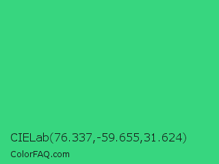 CIELab 76.337,-59.655,31.624 Color is a normal green color and the nearest color is UFO Green #3cd070. Hex code #37d67f and RGB value is rgb(55,214,127). In RGB color space, this color is composed of 22% red, 84% green, 50% blue, In CMYK color space, this color is composed of 74% cyan, 0% magenta, 41% yellow , 16% black , In HSL color space, this color has a hue angle of 147° , 66% saturation and 53% lightness.