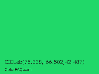 CIELab 76.338,-66.502,42.487 Color is a normal green color and the nearest color is UFO Green #3cd070. Hex code #20d869 and RGB value is rgb(32,216,105). In RGB color space, this color is composed of 13% red, 85% green, 41% blue, In CMYK color space, this color is composed of 85% cyan, 0% magenta, 51% yellow , 15% black , In HSL color space, this color has a hue angle of 144° , 74% saturation and 49% lightness.